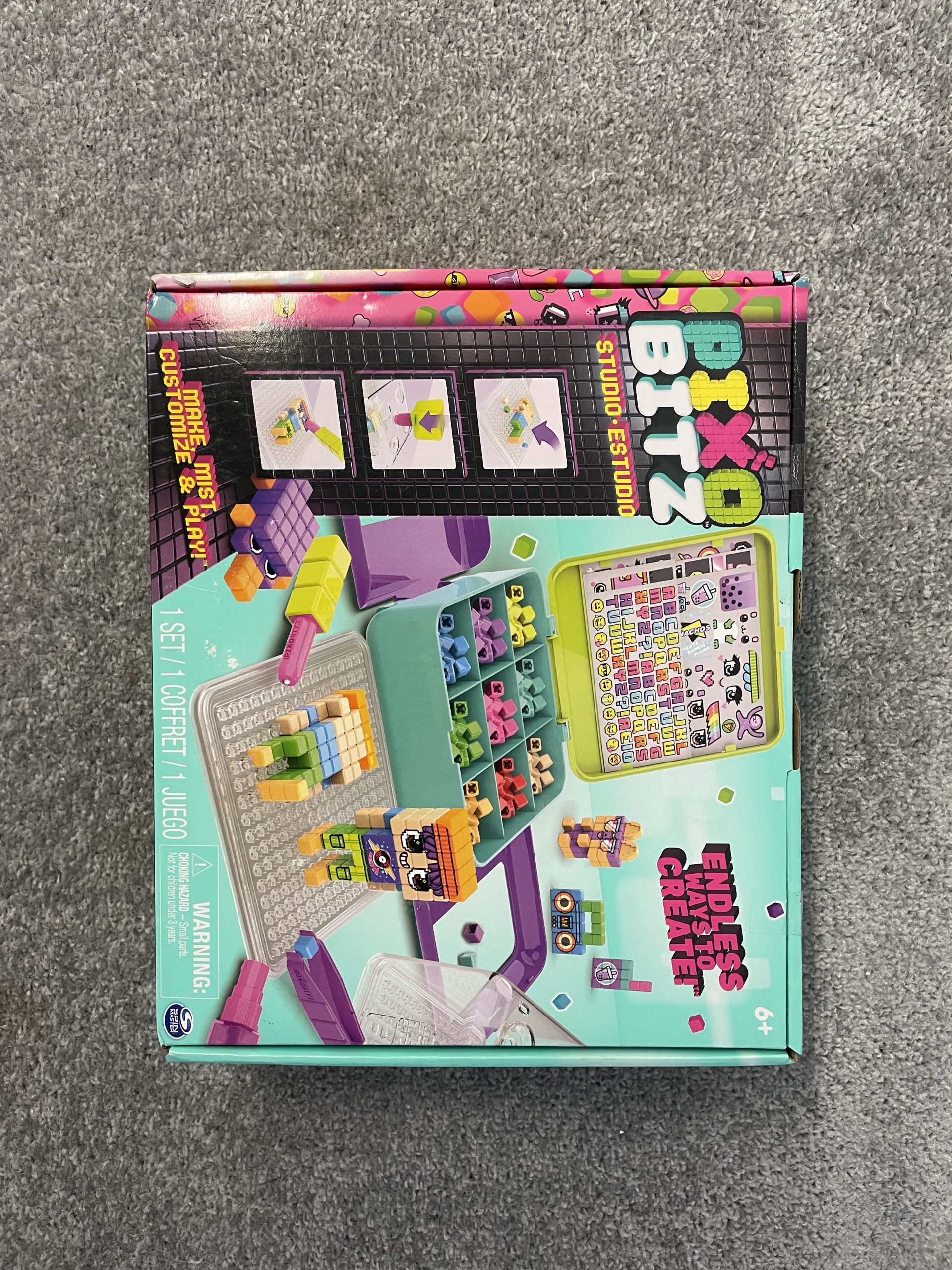 The Pixobitz Studio features 500 Bitz (cube-shaped water fuse beads) in 10 colours, 14 accessories, over 100 water transfer decos, four easy-to-use tools, two trays and three template cards.